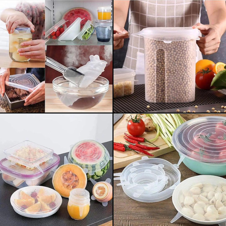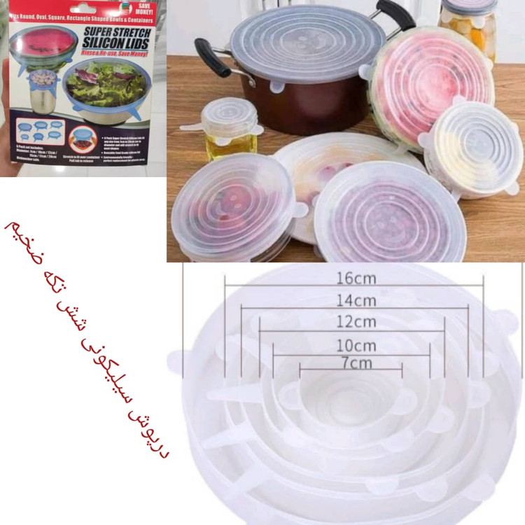 درپوش ظرف مدل سیلیکونی مجموعه 6 عددی ; تعداد : شش عدد ; جنس بدنه : سیلیکون ; قابلیت شستوشو : با دست، با ماشین ظرفشویی